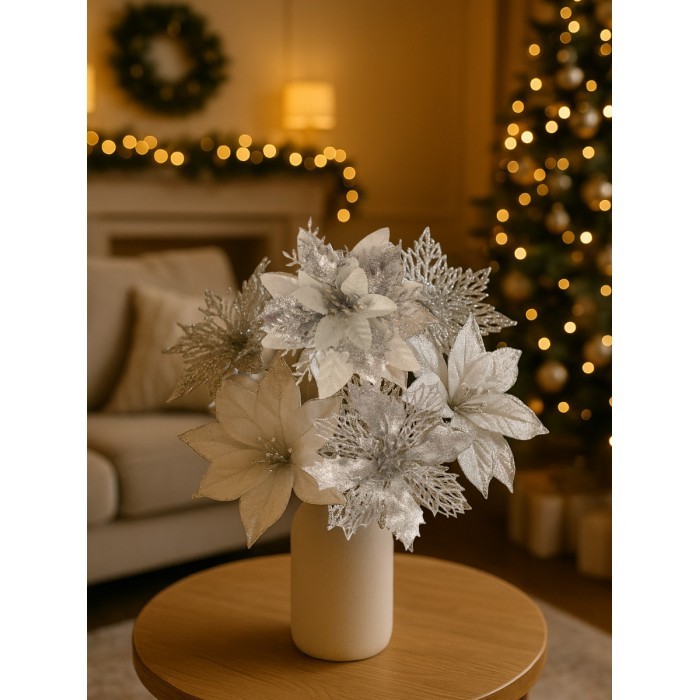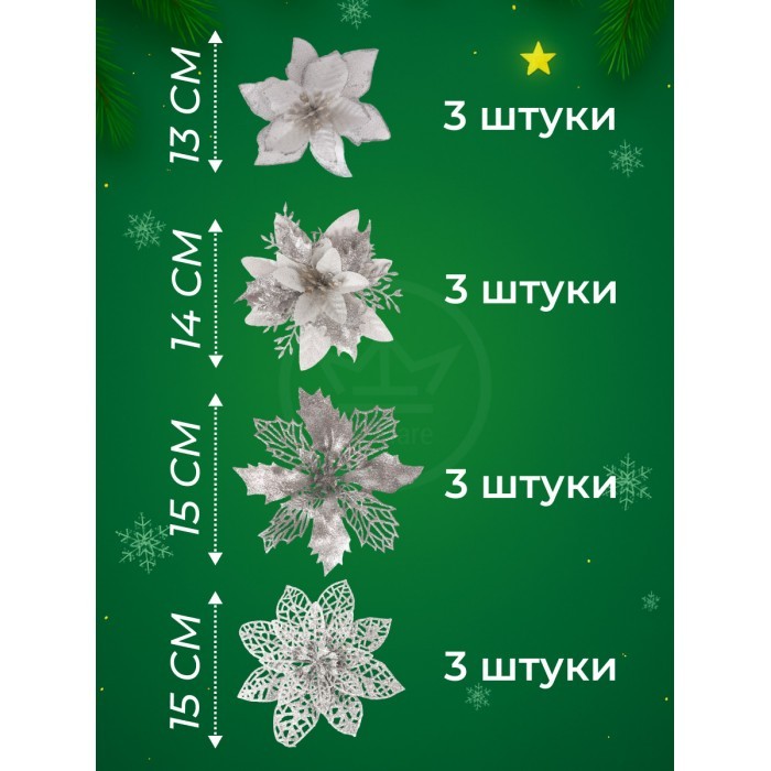 Набор Цветы Пуансеттия (12 штук - 13/14/15 см + проволока+зажимы) серебро 266219