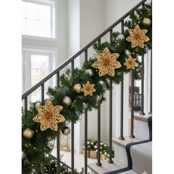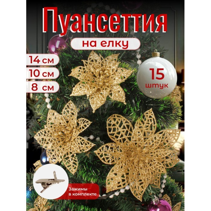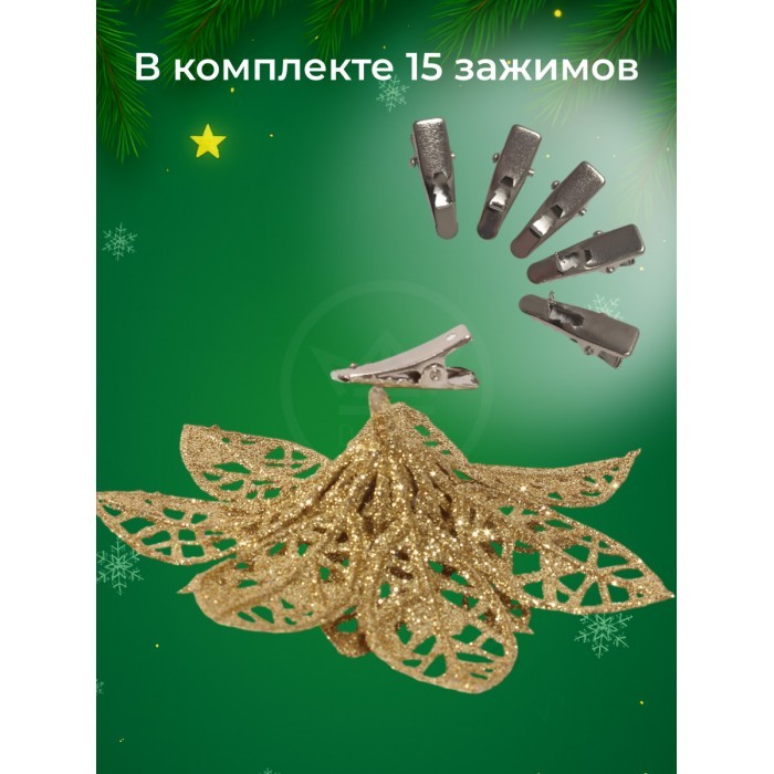 Набор Цветы Пуансеттия (15 штук - 8см-5шт/10см-5шт/14см--5шт+зажимы 15шт) золото 266224