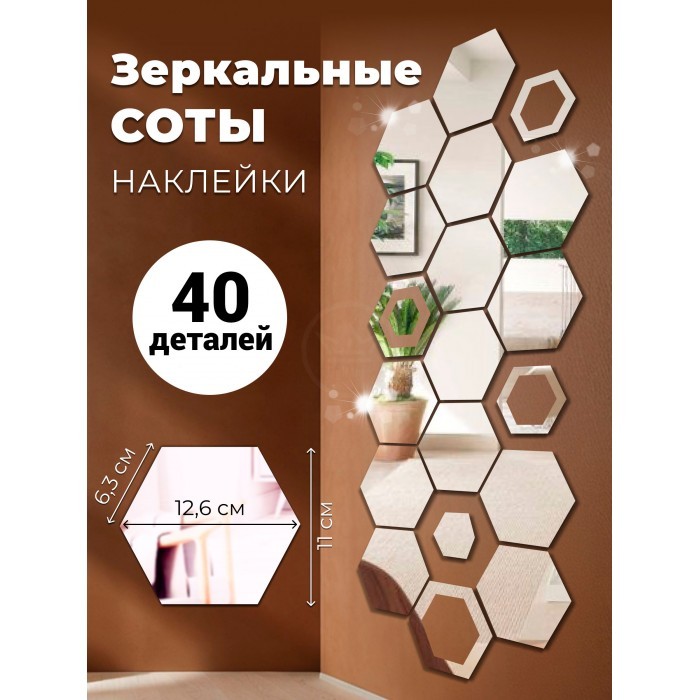 Интерьерные зеркальные наклейки Соты-2шт, 28+4шт серебро 265877