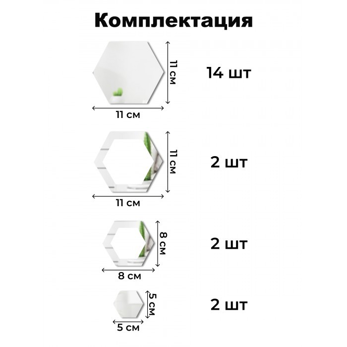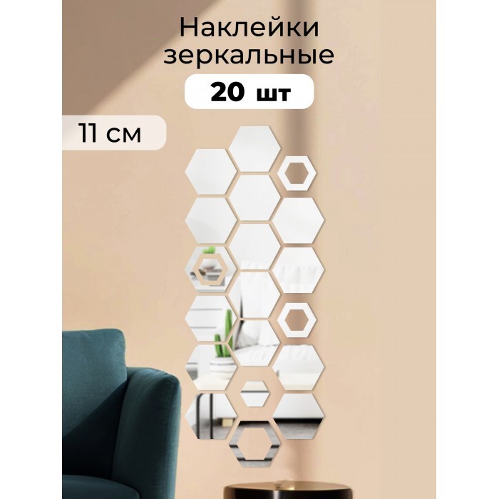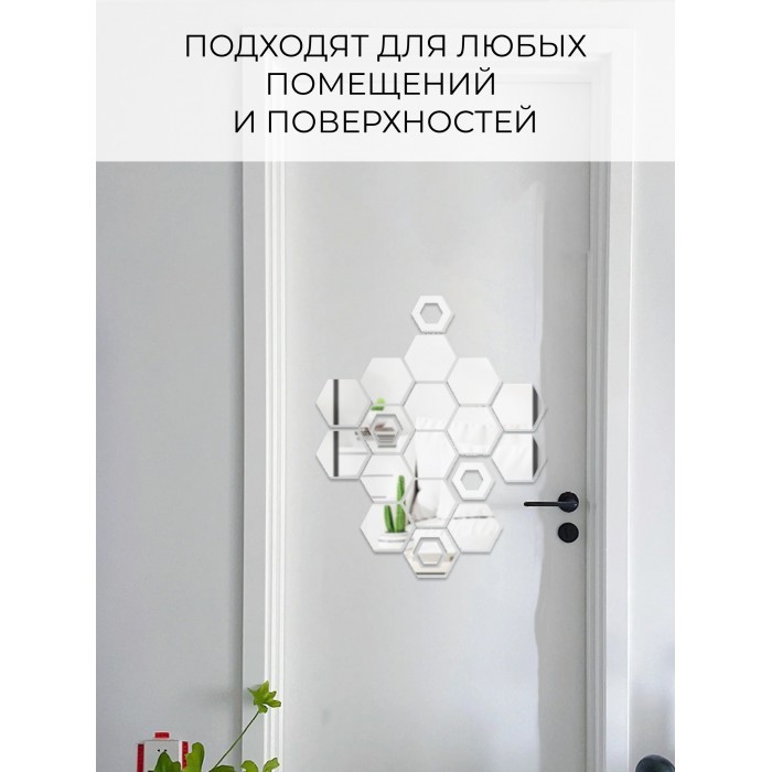 Интерьерные зеркальные наклейки Соты-1шт, 14+2шт серебро 265538