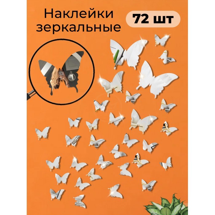 Интерьерные зеркальные наклейки Бабочки-2 набора ( 72 штук ) серебро 266107