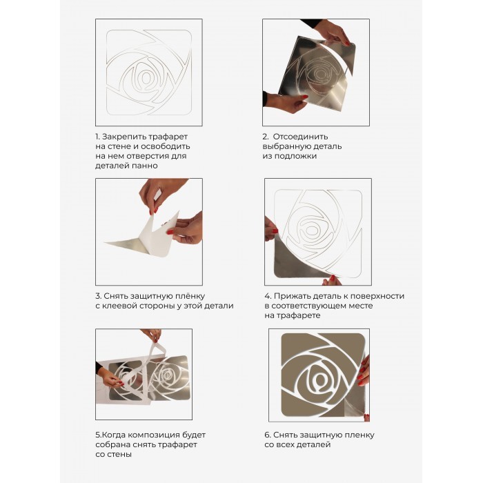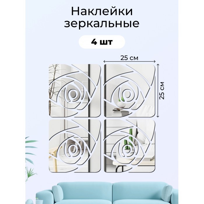Интерьерные зеркальные наклейки Квадрат-Роза (4 шт - 25*25 см, ТРАФАРЕТ) серебро 265974